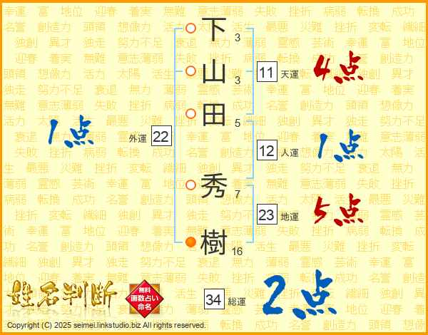 下(3画)山(3画)田(5画) 秀(7画)樹(16画)