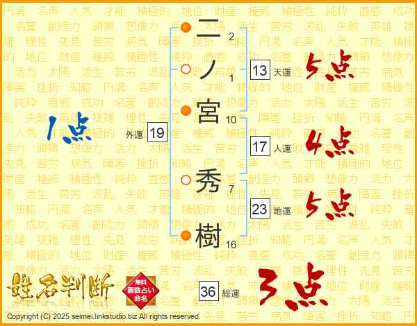 二(2画)ノ(1画)宮(10画) 秀(7画)樹(16画)