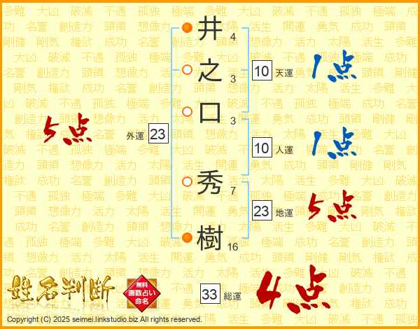 井(4画)之(3画)口(3画) 秀(7画)樹(16画)
