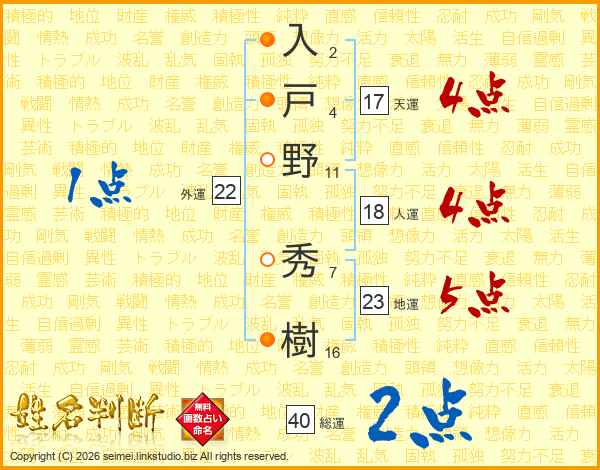 入(2画)戸(4画)野(11画) 秀(7画)樹(16画)