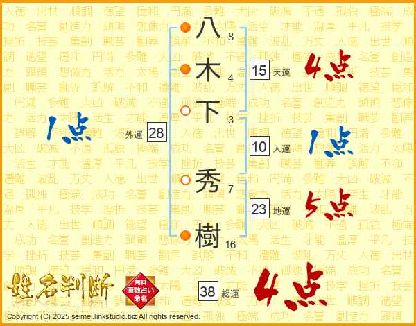 八(8画)木(4画)下(3画) 秀(7画)樹(16画)