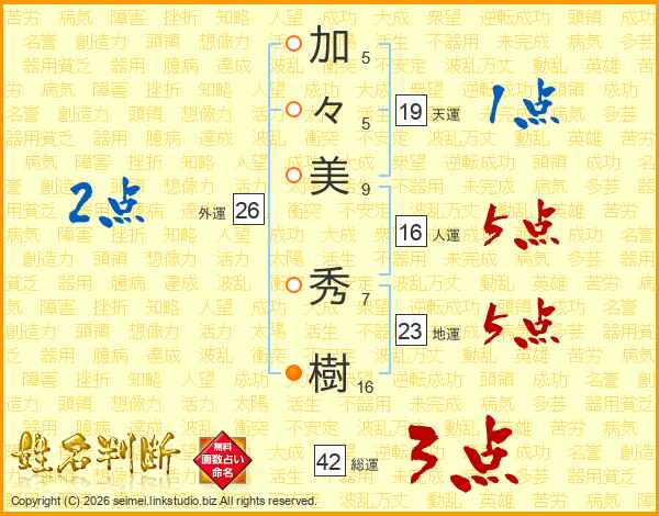 加(5画)々(5画)美(9画) 秀(7画)樹(16画)