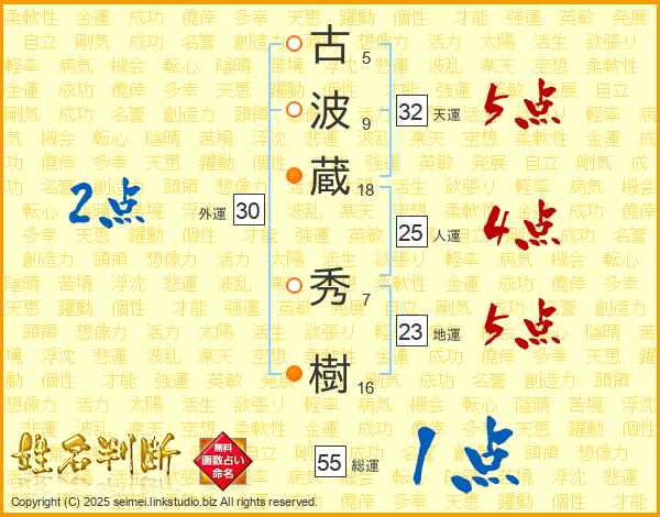 古(5画)波(9画)蔵(18画) 秀(7画)樹(16画)