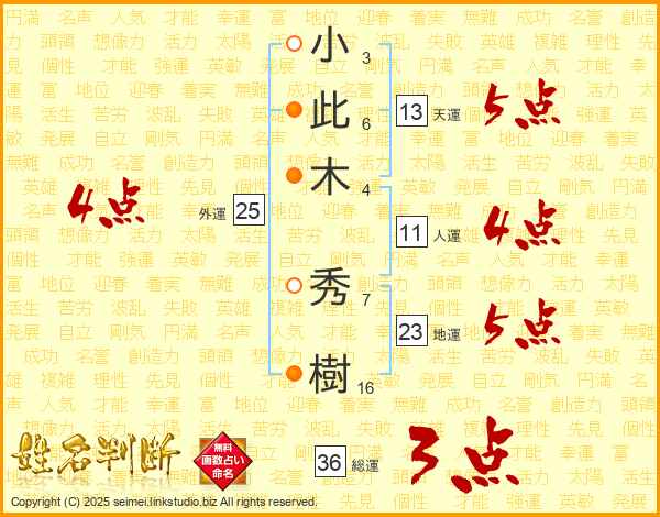 小(3画)此(6画)木(4画) 秀(7画)樹(16画)