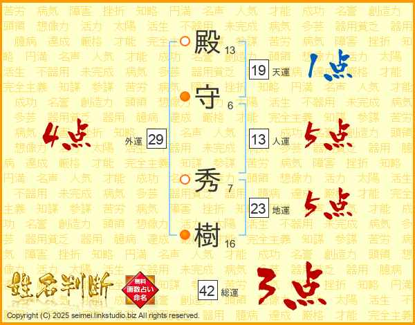 殿(13画)守(6画) 秀(7画)樹(16画)
