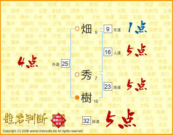 畑(9画) 秀(7画)樹(16画)