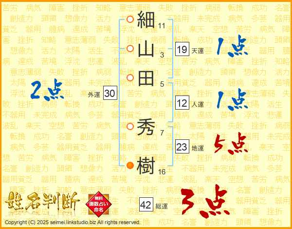 細(11画)山(3画)田(5画) 秀(7画)樹(16画)