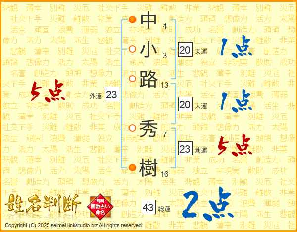 中(4画)小(3画)路(13画) 秀(7画)樹(16画)