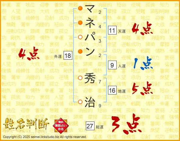 マ(2画)ネ(4画)パ(3画)ン(2画) 秀(7画)治(9画)