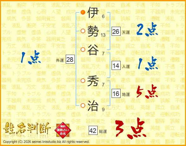 伊(6画)勢(13画)谷(7画) 秀(7画)治(9画)