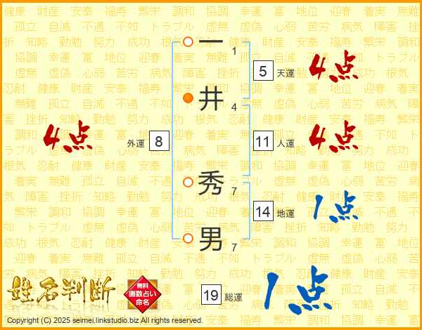 生活面を象徴する運勢です。外部から受ける影響力を表し、結婚運、家庭運や職場、環境への順応性を表します。総運から人運を引いた画数。姓や名が1文字の場合を除く。
