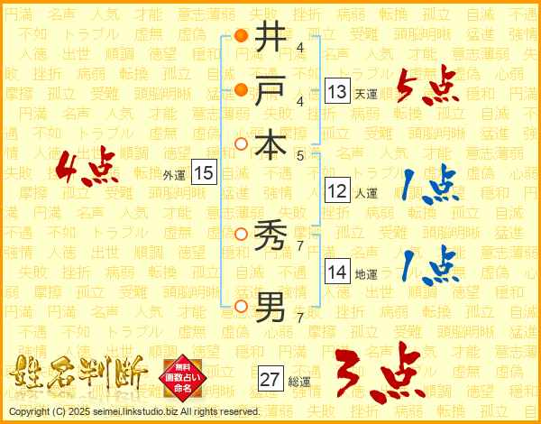 井(4画)戸(4画)本(5画) 秀(7画)男(7画)