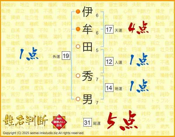 伊(6画)牟(6画)田(5画) 秀(7画)男(7画)