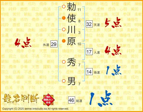 勅使川原秀男さんの天運は32画の5点!