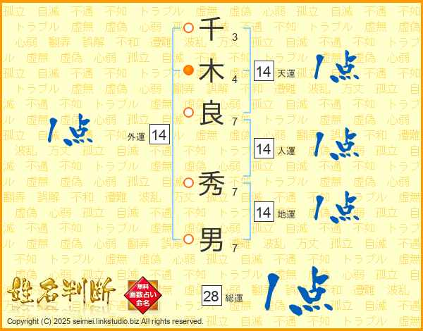 千(3画)木(4画)良(7画) 秀(7画)男(7画)