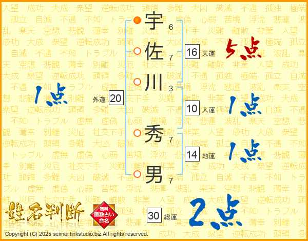 宇(6画)佐(7画)川(3画) 秀(7画)男(7画)