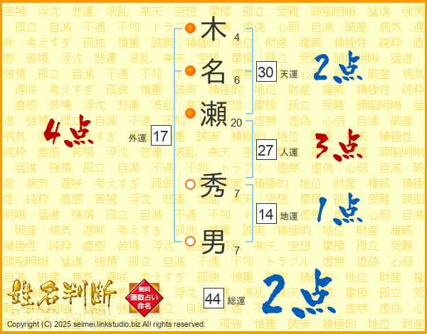 木(4画)名(6画)瀬(20画) 秀(7画)男(7画)