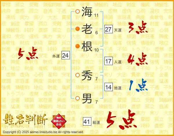 海(11画)老(6画)根(10画) 秀(7画)男(7画)