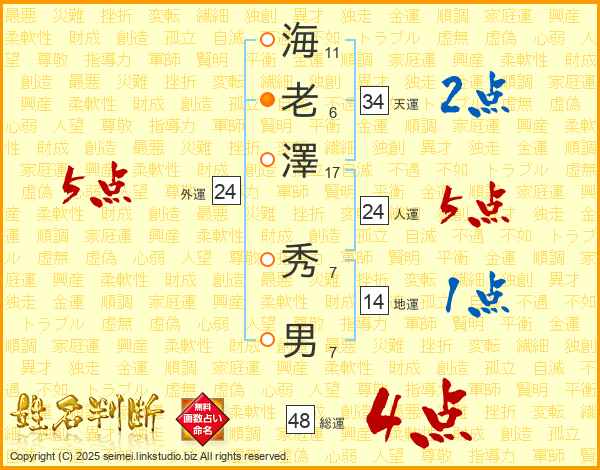 海(11画)老(6画)澤(17画) 秀(7画)男(7画)