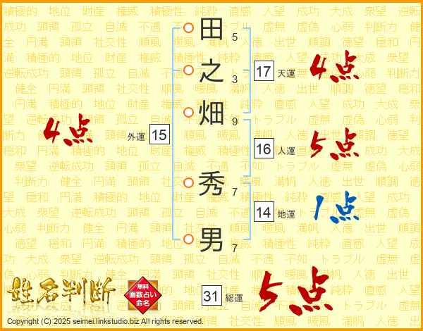田(5画)之(3画)畑(9画) 秀(7画)男(7画)