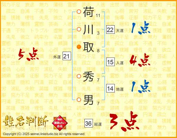 荷(11画)川(3画)取(8画) 秀(7画)男(7画)