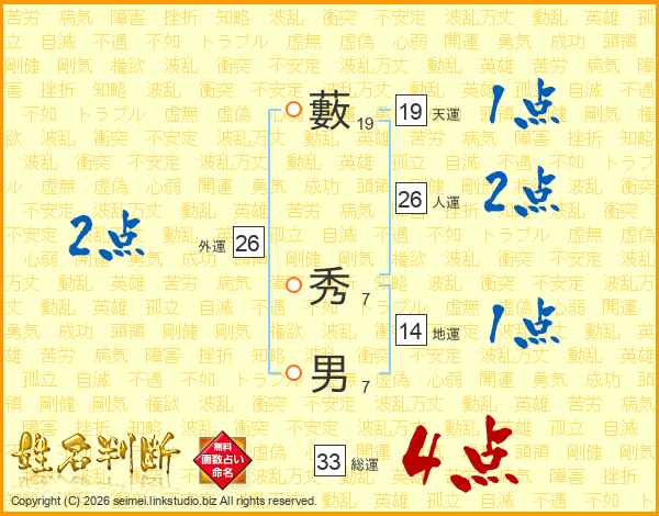 生活面を象徴する運勢です。外部から受ける影響力を表し、結婚運、家庭運や職場、環境への順応性を表します。総運から人運を引いた画数。姓や名が1文字の場合を除く。
