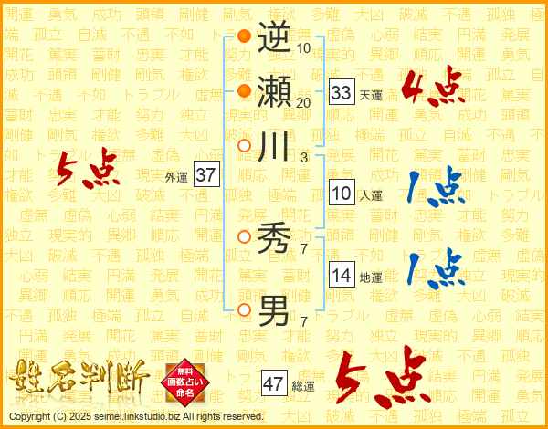 逆瀬川秀男さんの総運は47画の5点!