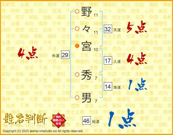 野(11画)々(11画)宮(10画) 秀(7画)男(7画)