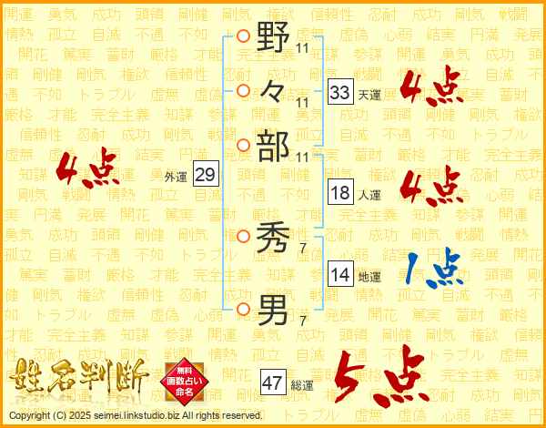 野(11画)々(11画)部(11画) 秀(7画)男(7画)