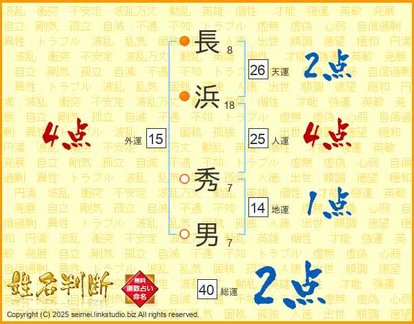 生活面を象徴する運勢です。外部から受ける影響力を表し、結婚運、家庭運や職場、環境への順応性を表します。総運から人運を引いた画数。姓や名が1文字の場合を除く。