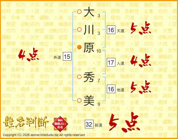 大(3画)川(3画)原(10画) 秀(7画)美(9画)