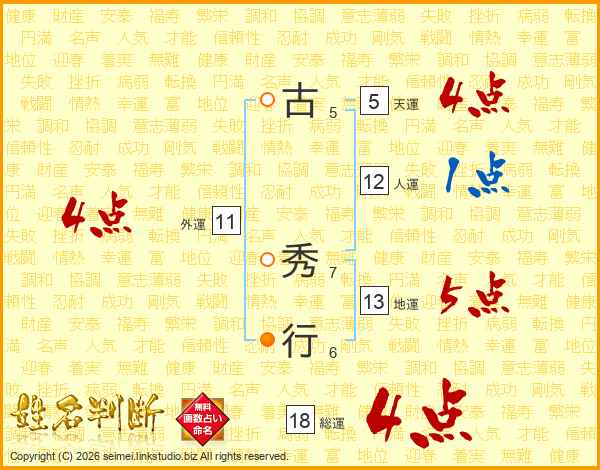あなたの人生を表す1番重要な運勢です。生涯を通じて影響する総合運となり、主に50歳以降の晩年期に影響を及ぼします。苗字と名前の合計画数。