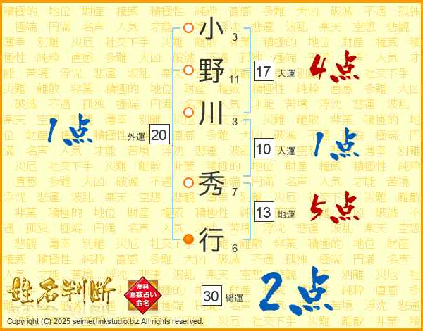 小(3画)野(11画)川(3画) 秀(7画)行(6画)