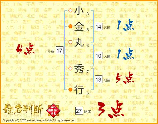 小(3画)金(8画)丸(3画) 秀(7画)行(6画)