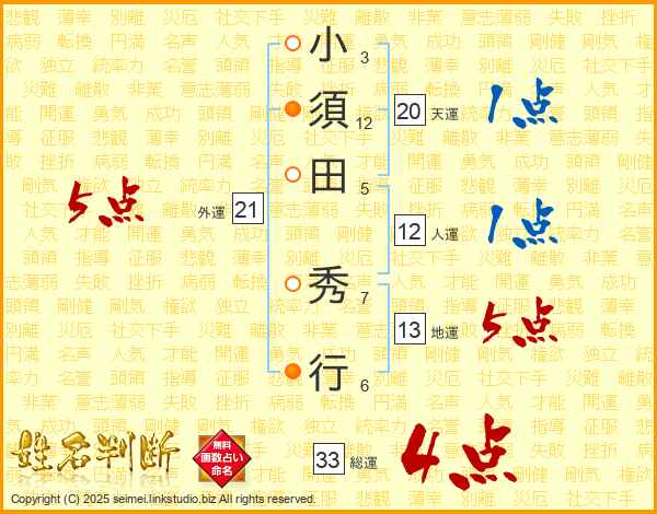 小(3画)須(12画)田(5画) 秀(7画)行(6画)