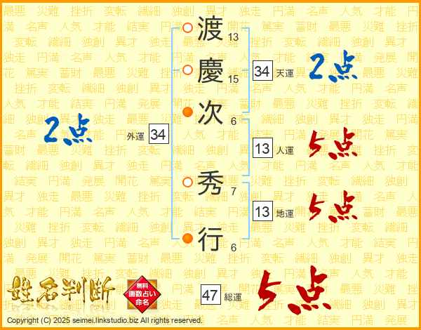 渡(13画)慶(15画)次(6画) 秀(7画)行(6画)