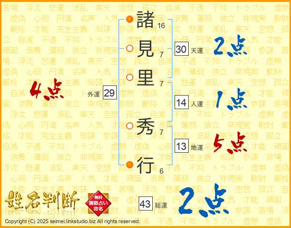 諸見里秀行さんの総運は43画の2点!