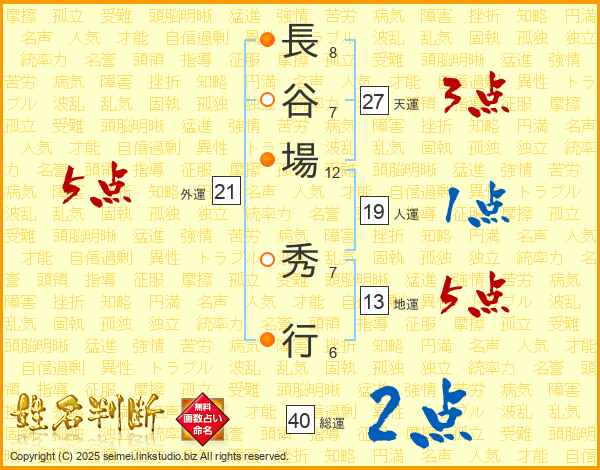 長(8画)谷(7画)場(12画) 秀(7画)行(6画)