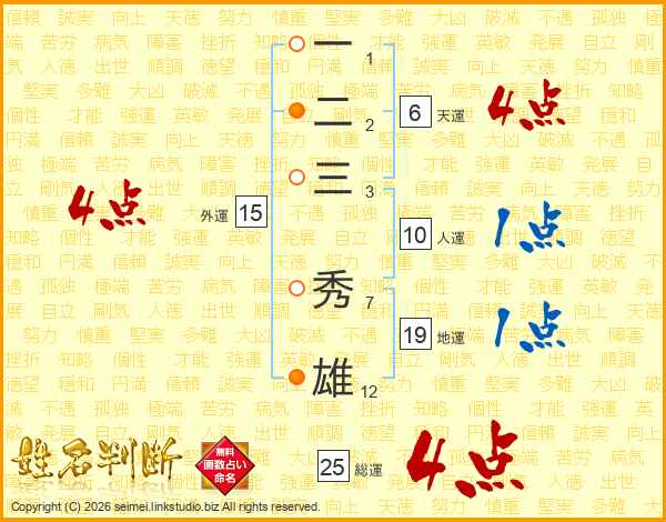 一(1画)二(2画)三(3画) 秀(7画)雄(12画)