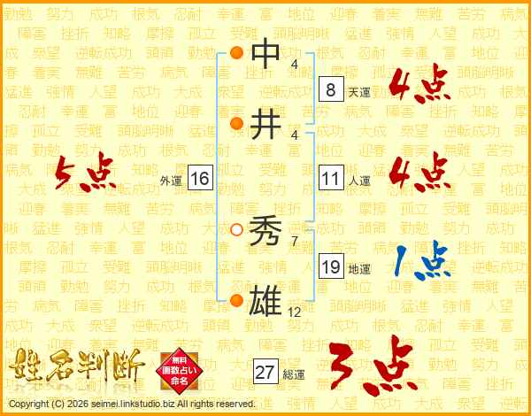 生活面を象徴する運勢です。外部から受ける影響力を表し、結婚運、家庭運や職場、環境への順応性を表します。総運から人運を引いた画数。姓や名が1文字の場合を除く。