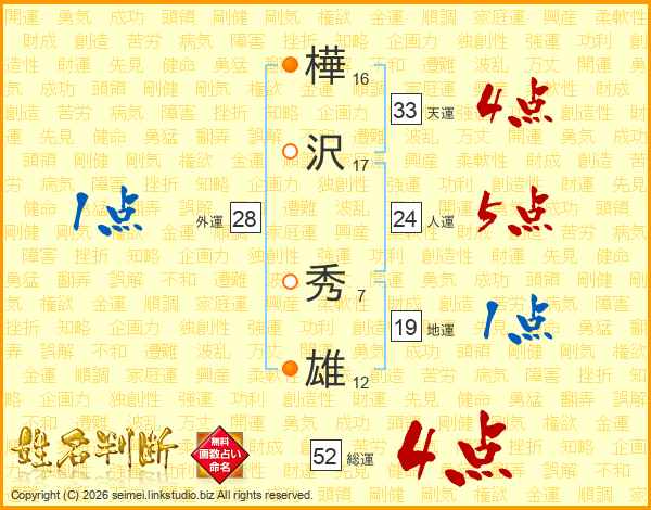 樺(16画)沢(17画) 秀(7画)雄(12画)