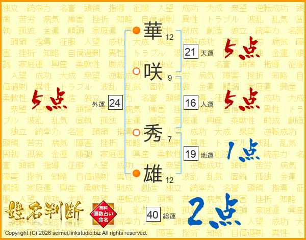 華(12画)咲(9画) 秀(7画)雄(12画)