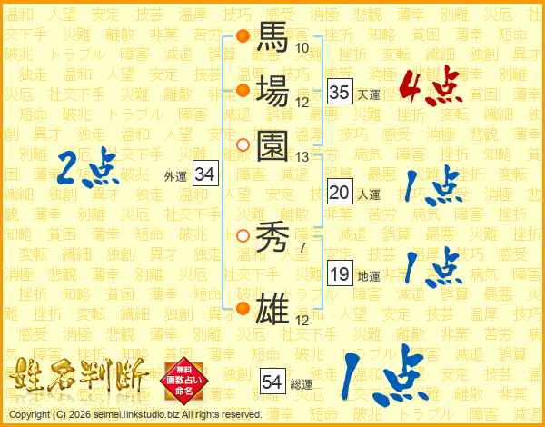 馬(10画)場(12画)園(13画) 秀(7画)雄(12画)