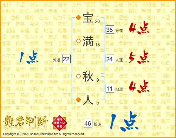 宝(20画)満(15画) 秋(9画)人(2画)