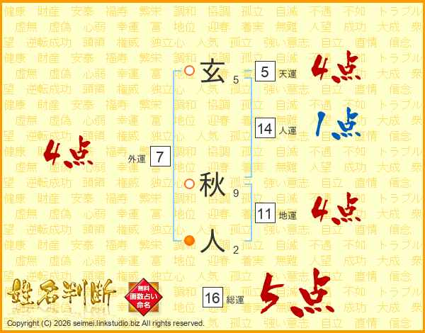 玄秋人さんの総運は16画の5点!