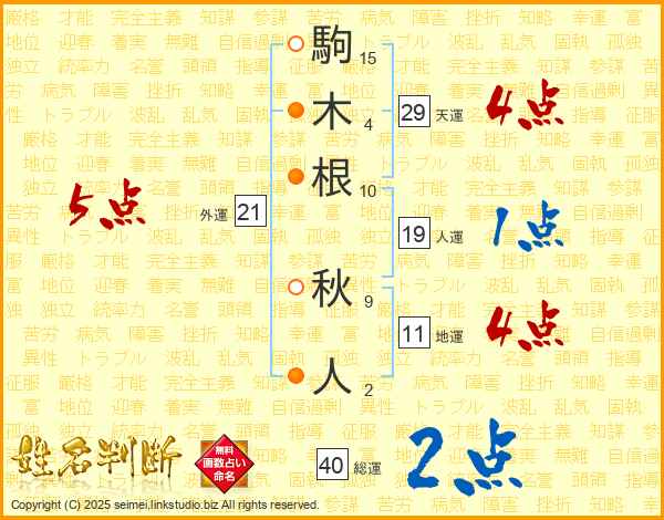 駒(15画)木(4画)根(10画) 秋(9画)人(2画)