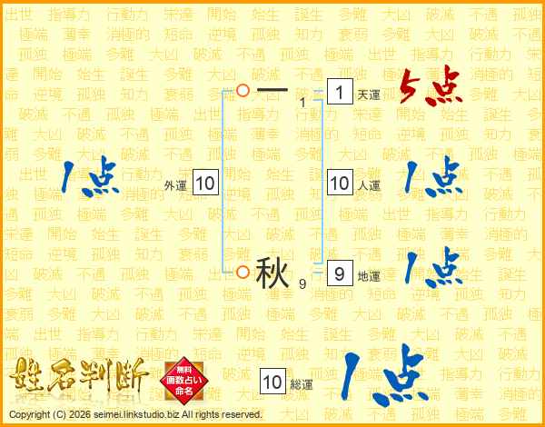 生活面を象徴する運勢です。外部から受ける影響力を表し、結婚運、家庭運や職場、環境への順応性を表します。総運から人運を引いた画数。姓や名が1文字の場合を除く。
