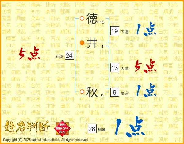 徳(15画)井(4画) 秋(9画)