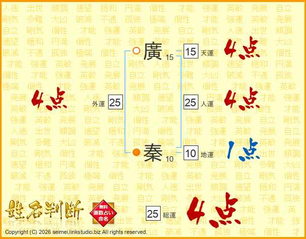 生活面を象徴する運勢です。外部から受ける影響力を表し、結婚運、家庭運や職場、環境への順応性を表します。総運から人運を引いた画数。姓や名が1文字の場合を除く。