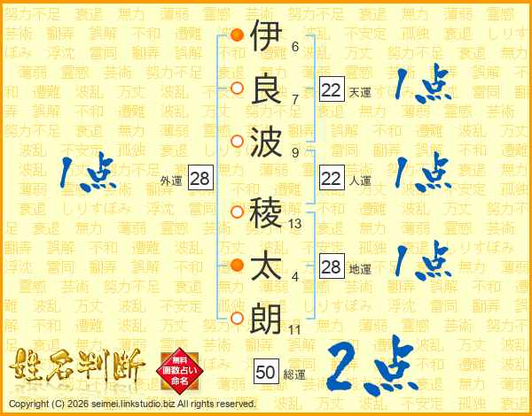 伊(6画)良(7画)波(9画) 稜(13画)太(4画)朗(11画)